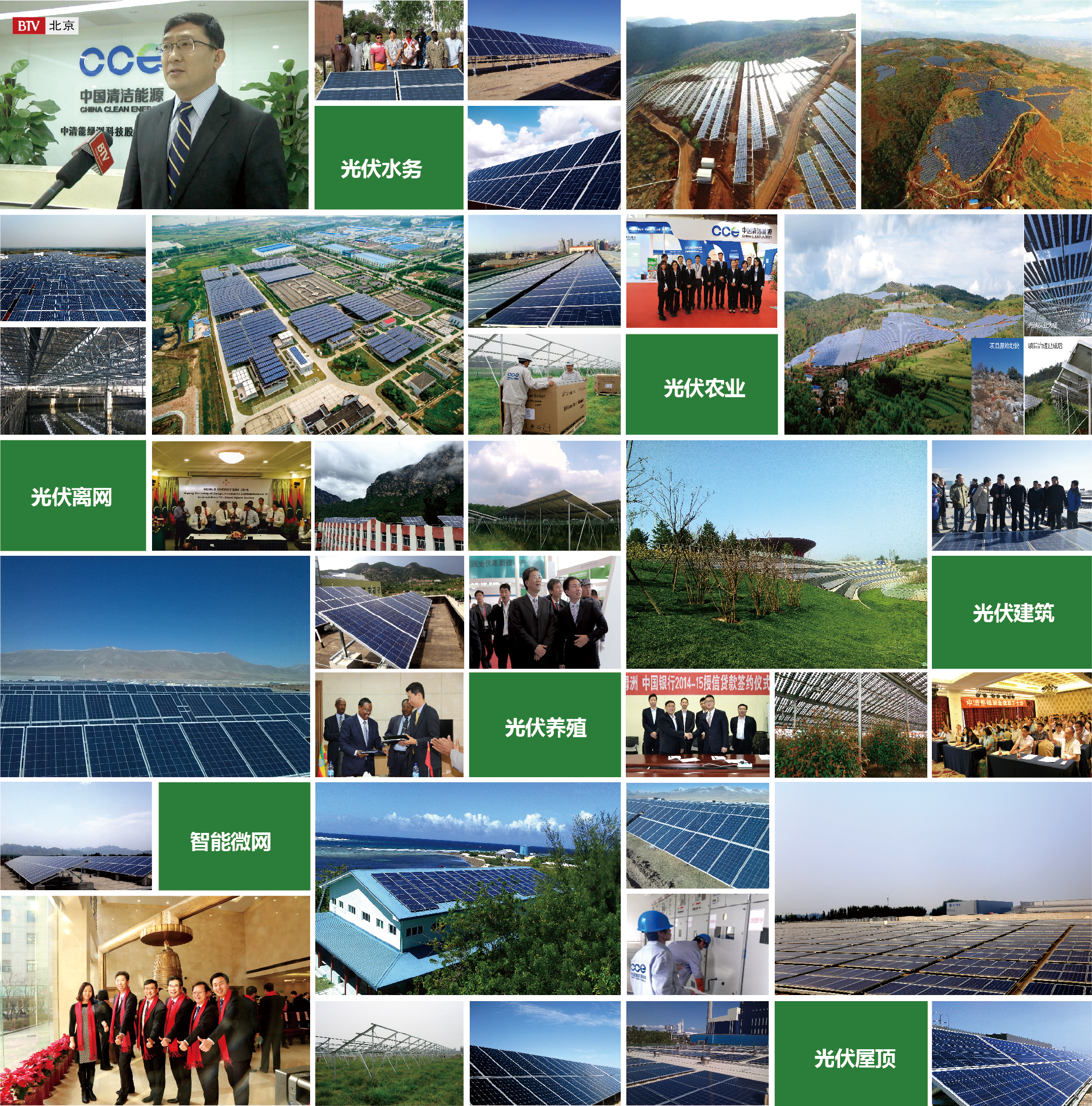 公司长期专注于“光伏+”的多产业融合综合集群性开发,领域涉及光伏现代农牧旅、智能微网、分布式光伏电站、大型集中式光伏电站等板块,集项目开发、投资、建设、运营、技术研发为一体,是国家级高新技术企业。公司成立八年以来,坚持打造自身的核心竞争力,以综合集群性开发为导向,以追求政府-客户-企业多赢为原则,先后在国内外投资建设光伏发电项目超过700兆瓦,其中包括海峡两岸新能源合作典型项目-海南东方50兆瓦项目太空农业光伏、云南昆明100兆瓦石漠化荒山治理+光伏农业示范项目、山东聊城40兆瓦光伏农业旅游景观示范项目、新疆建设兵团40兆瓦盐碱地治理+光伏农牧一体化示范项目、浙江金华兰溪80兆瓦光伏农业渔业一体化项目,扬州10兆瓦光伏水务、河北沧州1兆瓦光伏水务、上海宝钢50兆瓦、青海玉树水光储4兆瓦、北京雁栖湖APEC会场2兆瓦多能互补、马尔代夫海岛光柴储多能智能互补等一批国内外知名项目。此外,公司是国家能源局首批18家分布式光伏集中应用示范区的承建单位之一,负责顺义空港200 兆瓦项目的开发投资建设及售电业务。