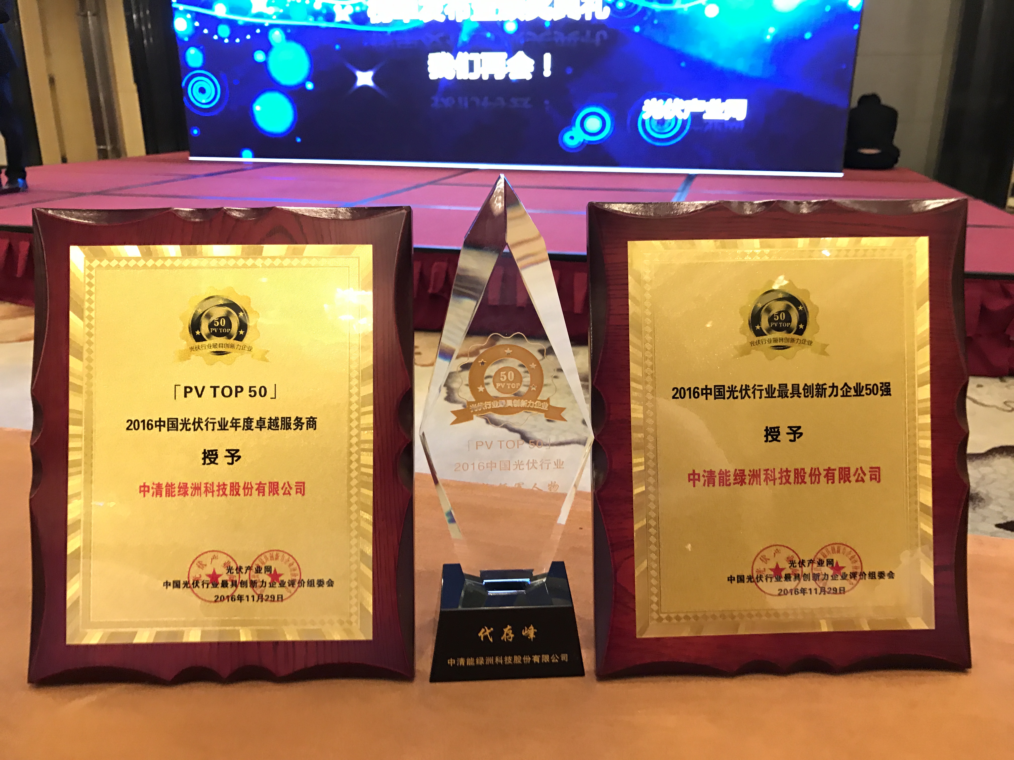 “2016中国光伏行业最具创新力企业榜单发布暨颁奖典礼(PV TOP 50)”于11月29日在上海淳大万丽酒店举行。中清能绿洲凭借多年“光伏+”的多产业融合综合集群性开发、投资理念,以及在光伏水务领域的开拓性创新及专利技术,和8年53国家EPCO集成经验,斩获2016中国光伏行业最具创新力企业”、“2016中国光伏行业年度卓越服务商”两项大奖,董事长代存峰获“2016中国光伏行业创新领军人物”。