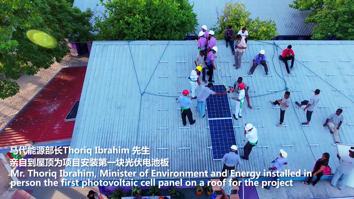 项目开工时,马代能源部长亲自到屋顶为项目安装第一块光伏电池板