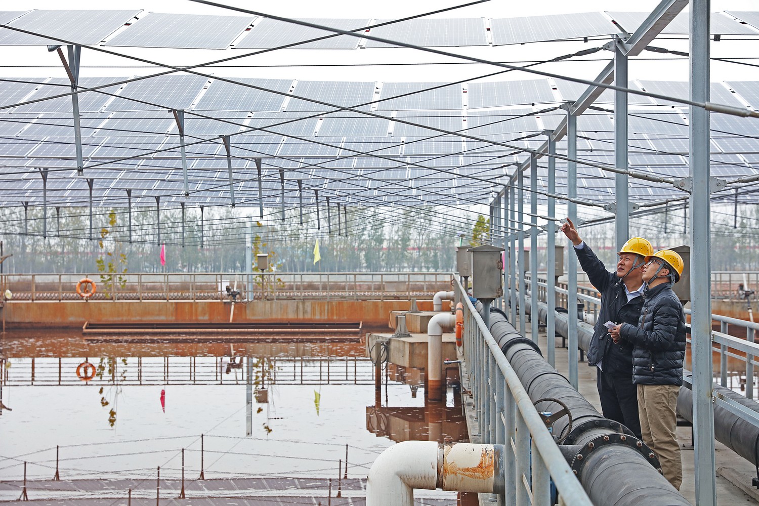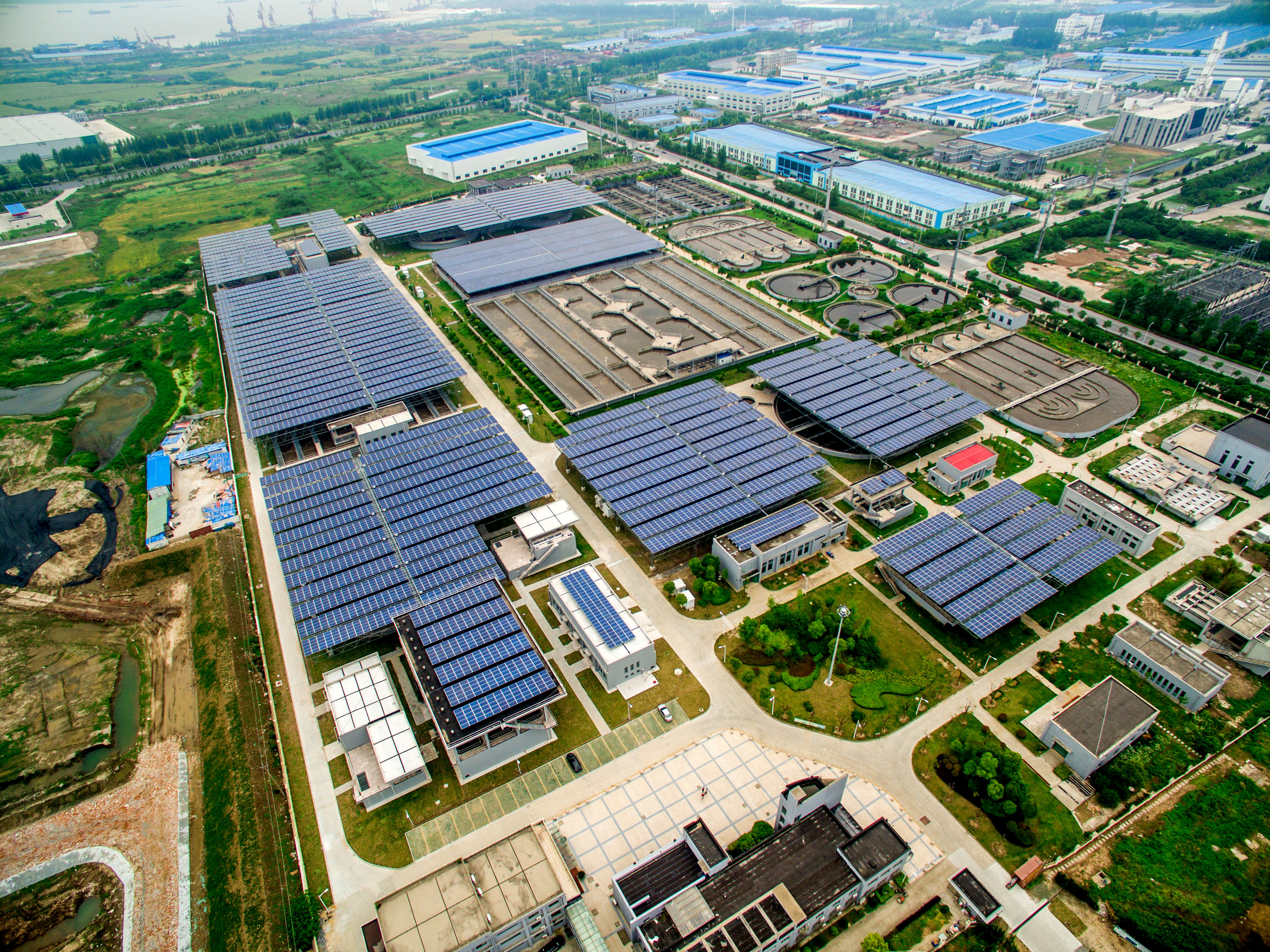 由中清能绿洲公司承建的扬州洁源9.7兆瓦分布式光伏发电项目是国内首次将光伏发电与污水处理设施有机结合,有效利用三个厂区(六圩污水处理厂、汤汪污水处理厂和自来水公司第一水厂)池面建设大面积、大跨度的螺旋球节点